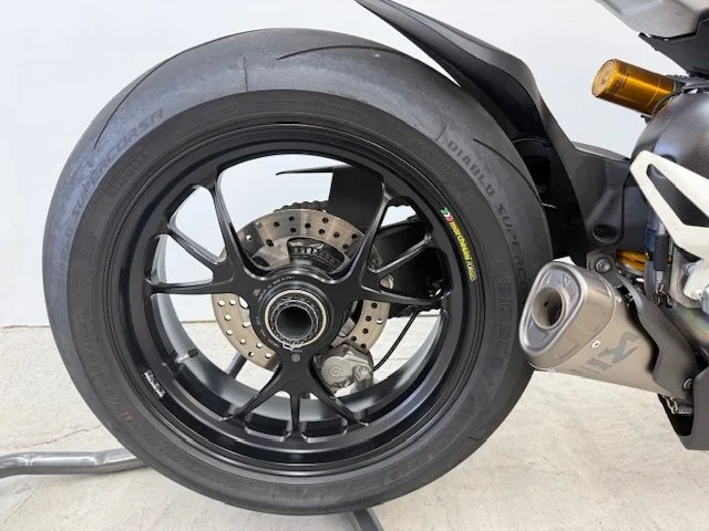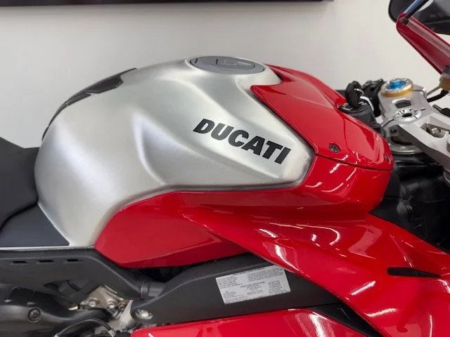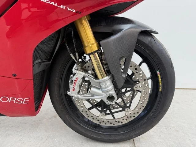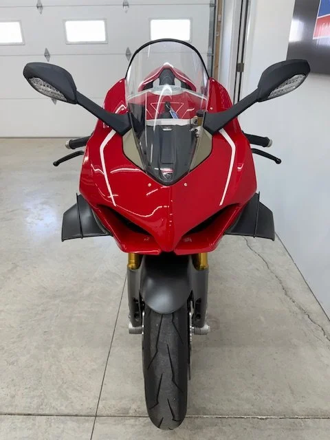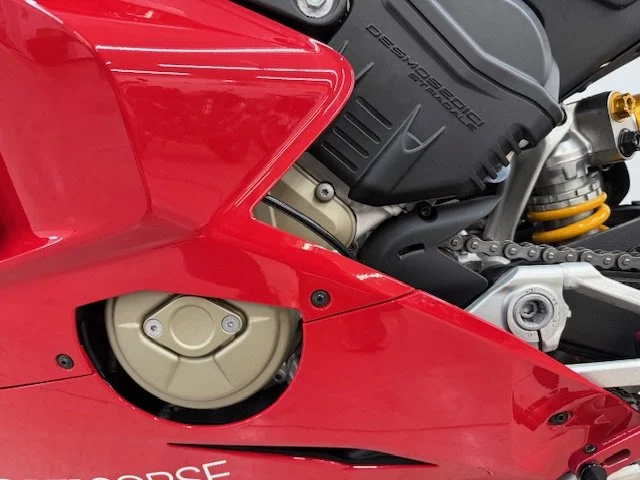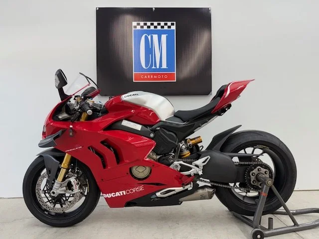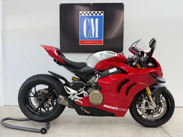 The 2020 Ducati Panigale V4R is a road-legal superbike derived from the brand's World Superbike racing efforts, featuring a 998cc V4 engine that produces 221 horsepower. It is designed for track performance with a focus on aerodynamics (including MotoGP-style winglets), lightweight construction with carbon fiber components, and advanced electronics like traction control, wheelie control, and cornering ABS. The V4R is known for its mechanical and track-oriented suspension, a dry clutch, and high-revving engine capable of reaching 16,500 RPM.