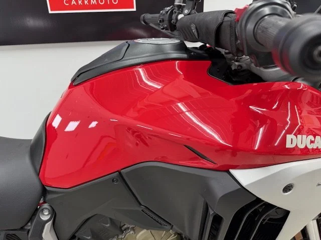 This 2022 Ducati Multistrada V4S is a high-tech, versatile adventure-touring motorcycle featuring Ducati's powerful 170hp V4 Granturismo engine, an advanced electronics suite with front/rear radar for Adaptive Cruise Control and Blind Spot Detection, and electronic Skyhook suspension, all wrapped in sporty bodywork designed for both road performance and off-road capability, offering long service intervals for enhanced practicality.